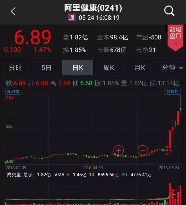 虽然近期阿里健康股票连续大涨,但截至2018年5月24日收盘,阿里健康报6.89港元,较最高价14.32港元仍然跌去50%。