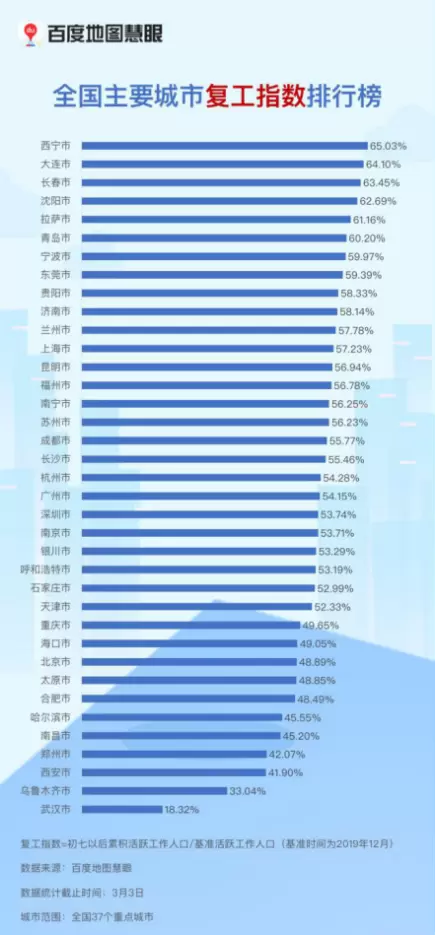 百度地图大数据也持续跟进复工指数,聚焦全国37个主要城市的复工情况。据最新发布数据显示,截至2020年3月3日,全国(除港澳台)范围复工指数已达57.42%,全国37个主要城市中大部分城市复工指数超50%,其中西宁、大连、长春、沈阳、拉萨、青岛复工复产指数较高,均在60%以上。整体来看,当前全国整体复工指数呈逐渐增长的态势。