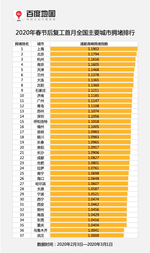 百度地图“数说”节后复工首月城市拥堵排名 沪京杭交通活跃度明显上升