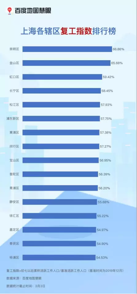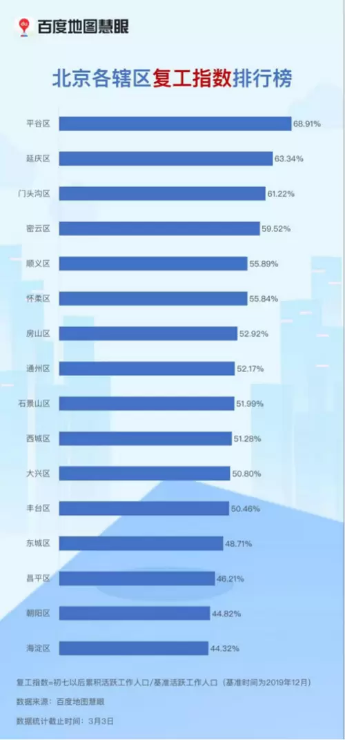 百度地图慧眼深度跟进复工指数,不仅城市范围上从此前的19个拓展到37个重点城市,而且数据维度上也从城市级细化至区县级,发布北京及上海市各辖区复工指数排行榜。