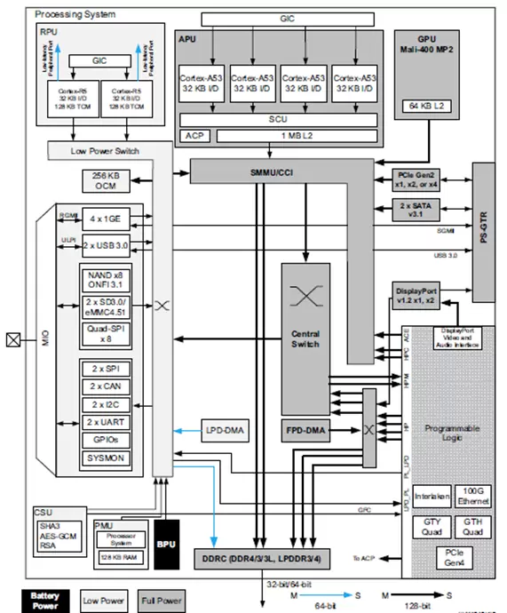 Zynq UltraScale+ MPSoC架构提供频率高达1.5GHz的四核Cortex®-A53高效64位ARMv8应用处理器、具有双核ARM® Cortex®-R5 600MHz的实时低功耗协处理器,以及ARM® Mali™-400MP2 GPU达到667MHz,同时EV系列还包含H.265/H.264视频编解码器单元,可提供原生UltraHD压缩及专用引擎,满足动态电源管理与安全配置需求。Zynq UltraScale+ MPSoC平台系统顶层框图如下: