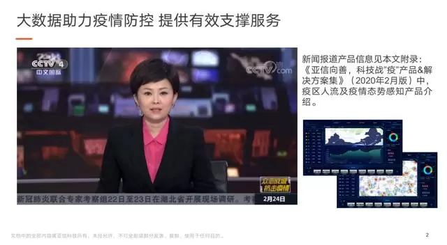 面向疫情感知,亚信科技迅速上线了重点区域监测系统、自动发现外来人员的监控系统、敏感区域的3D实景的监控系统以及外呼的自动化的信息收集系统。面向疫情认知,上线了疫情宏观信息系统,高危人群轨迹回溯系统和疫情感染风险预警系统。面向疫情预知,研发上线了疫情态势感知系统和疫情感染风险评估系统,为政府部门提供决策依据。