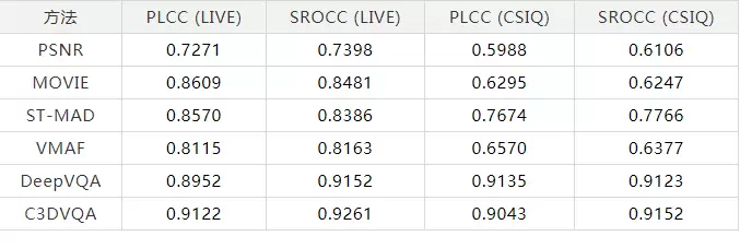 在评测结果上,腾讯多媒体实验室在LIVE和CSIQ两个视频质量数据集上对所提出算法的性能进行验证。并使用标准的PLCC和SROCC作为质量准则来比较不同算法的性能。将所提出的C3DVQA与常用的全参考质量评估算法进行对比,包括PSNR,MOVIE,ST-MAD,VMAF和DeepVQA,结果如下表所示。