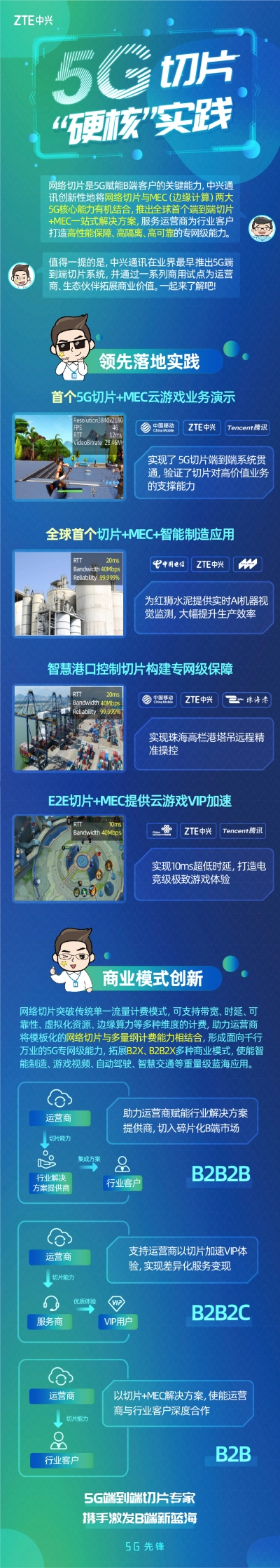 2019年11月,中兴通讯与广东移动、腾讯联合开通了5G端到端网络切片+MEC业务,5G环境下的云游戏应用进行了全方位的试点,打通了5G网络切片与OTT类业务相结合的整个流程,为网络切片的商用摸清了路径、积累了经验。 2019年12月,中兴通讯又与深圳联通、腾讯合作,构建了包含无线、承载、核心网以及编排的端到端5G切片商用网络,在腾讯滨海大厦总部无线室分环境下以切片优先级进行业务保障、承载网以Slicing channel技术适配差异化业务需求,核心网构建用户面独享的逻辑网络,并首次实现了基于位置的分级切片保障,打造云游戏、在线直播等多种互联网业务的极致体验。