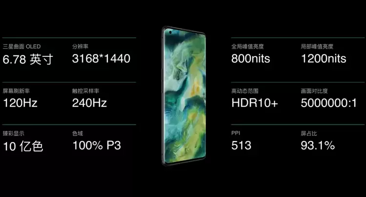 以Find X2系列定制的这块AMOLED屏幕为例,120Hz超高刷新率+240Hz触控采样率、3K QHD+分辨率、10 bit色彩显示、出厂校准JNCD≈0.4,采用独立的O1显示处理芯片,支持MEMC动态补偿等,各个参数都是目前行业最顶级的屏幕存在。