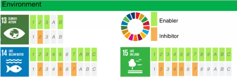 在环境领域中有25项细分目标(占比达93%)可以从人工智能中获益。用以持续改善生态系统。例如人工智能可以通过大规模数据分析来制定出统一协调的联合环保行动。就目标13应对气候变化而言,有证据表明人工智能的进步将帮助人们加深对气候变化的理解,促进对气候变化影响的建模工作。此外,人工智能也将提升低碳能源系统和高度集成的可再生能源系统效率,满足气候变化所需。