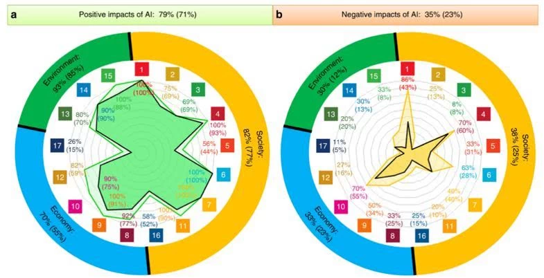 注:图3左侧绿色a部分表示AI对SDGs的积极影响占比79%,右侧橘黄色b部分表示AI对SDGs的消极影响占比达35%。饼状图代表17项SDGs目标,分别从社会、经济和环境三个领域维度表示AI的正面和负面影响。就积极影响而言,人工智能可以促进实现134个细分目标,分别占比达到82%、70%和93%;就消极影响而言,人工智能可能抑制59个细分目标,占比分别达38%、33%和30%。