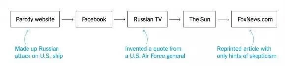 比如一则关于2014年俄罗斯战斗机与美国驱逐舰在黑海对峙的旧闻,经过一些八卦网站(Parody website)的篡改,变成了:俄罗斯空军配备一种神秘电磁武器,瞬间弄瘫了整艘美国军舰。