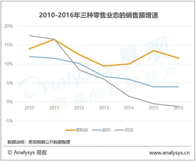 便利店作为一种零售形式,比商超百货更接近消费者。便利店业态销售增速在过去七年持续保持在9%的水平以上,成为市场布局的重点。根据中国连锁经营协会,2017年中国便利店销售额达到1900亿元,增速23%;门店数增至10.6万家,增长13%,表现抢眼。