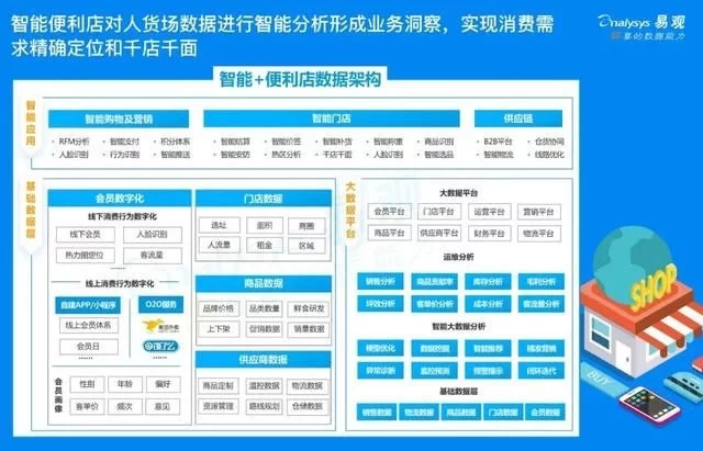 智能+便利店大数据平台的智能分析为门店智能运营提供业务洞察。智能+便利店数据架构包括:基础数据层、大数据平台层和智能应用层。