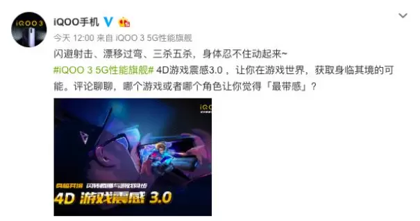 游戏体验更逼真 iQOO 3内置4D游戏震感3.0