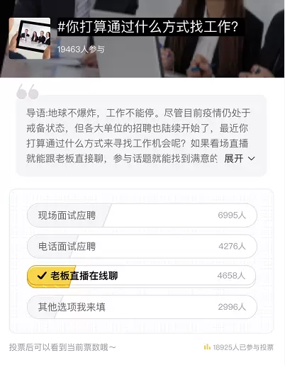 为了配合本次直播招聘,58部落上线话题#你打算通过什么方式找工作?#,引导用户热议找工作的方式方法。目前,已有近20000用户参与讨论,4600多人选择了“老板直播在线聊”。58部落网友@坚持把握表示,由于人在老家,想去外地不方便,通过直播在线聊,面试通过就可以进厂,这样更放心。网友@梦醒时分表示,老板直播在线聊更及时、方便,通过网上面试后,可约时间再面谈,避免在疫情期间来回奔波。