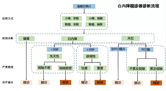 研究团队开发的产品可以实现,由患者在远程web服务器中输入一张裂隙灯拍摄的图片及年龄等基本信息,最终实现产品输出:(1)识别图片的拍照方式(四分类:①散瞳、弥散光照片,②散瞳、裂隙光照片,③正常瞳孔、弥散光照片,④正常瞳孔、裂隙光照片)(2)识别是否健康、白内障或是术后(3)识别白内障的轻重程度 (4)识别先天性白内障是否有完全遮盖视轴(5)识别白内障病人术后发障是否累及视轴 — (PCO模式),全程由系统自动识别和判断,大大减少医生的工作量。