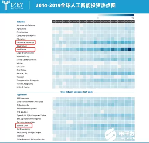 2019年,CB Insights分别按19个行业以及13个具体赛道对人工智能的股权交易制作了热点图。数据显示自2014年第1季度至2019年第4季度,全球有超过4300家人工智能初创公司筹集到了8410笔股权交易,总金额超过830亿美元。