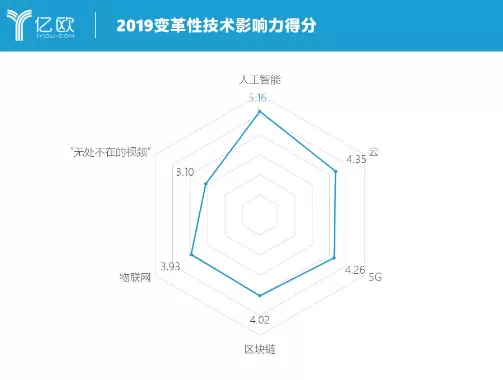 根据IHS Markit对六项变革性技术的影响力分析,人工智能远远领先于排名第二的云和其他四项技术,包括5G,区块链,物联网和“无处不在的视频”,如下图所示。
