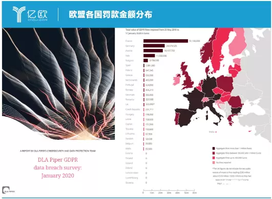 截至2020年1月,相关的罚款已经累积达1.14亿欧元,下图是GDPR生效以来至2020年1月份欧盟各个国家罚款的金额分布图,其中法国、德国、奥地利是罚款金额排名前三的国家。