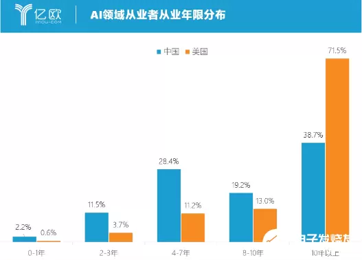2017年领英发布了《全球AI领域人才报告》,报告中显示国内绝大部分人工智能人才从业年限在10年以下,反观美国,从业10年以上的人工智能高端人才占到总数量的71.5%。