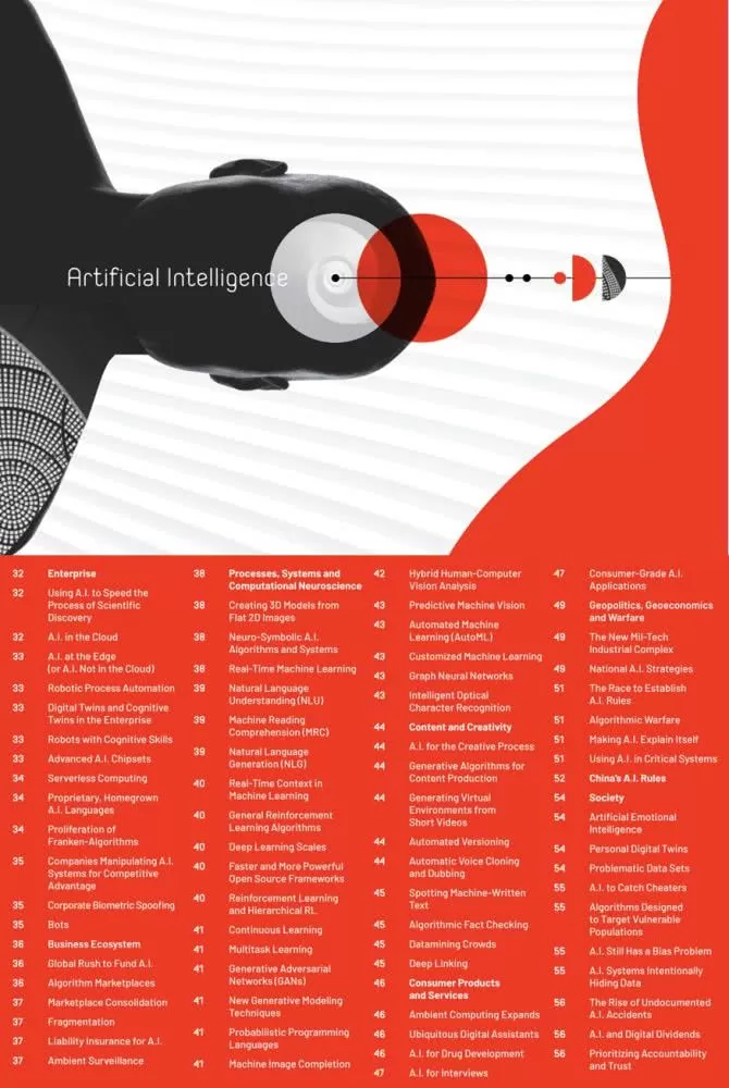 在所有前沿科技中,人工智能再次成为该榜单的第一名。韦伯表示,人工智能将引发第三次计算浪潮,带来积极的影响,例如 AlphaFold 在发现疾病的治疗方法中可以发挥的作用;但也会带来消极的影响,例如它当前对刑事司法系统的影响。