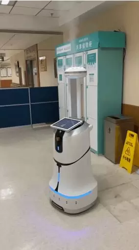 40分钟后,门诊大厅消毒工作顺利完成,机器人自动返回到充电桩进行电量续充,此时,一旁负责远程操控机器人的工作人员走过去,通过机身上12寸的屏幕对消毒情况进行了查看,随后通过机器人专用iPad安排机器人进入病房及病房走廊进行消毒。
