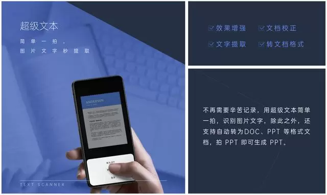 新加入的超级文本功能可以通过拍摄照片生成PPT和Word文档,这项功能在日常学习或者工作中需要记录的时候能够快速帮助用户。它可以通过拍摄的方式来识别来将图片内容转成DOC、PPT等文档格式,并且提供文档矫正、文字增强以及文字提取提供能,避免拍摄后再上电脑操作的问题。