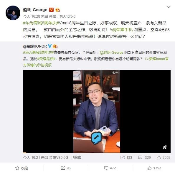 3月18日下午,荣耀总裁赵明通过微博透露“明天将宣布一条有关新品的消息,一款由内而外的全芯之作”。这里面的“全芯之作”透露着即将公布的荣耀30S,会搭载全新的麒麟8205G芯片。