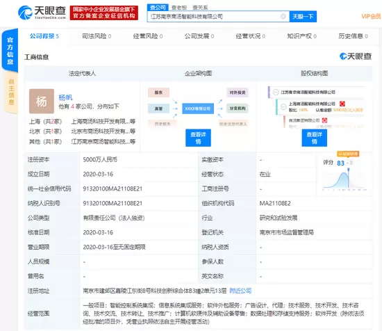 天眼查数据显示,3月16日,江苏南京商汤智能科技有限公司成立,注册资本5000万元人民币,法定代表人为公司联合创始人、副总裁杨帆,经营范围包括智能控制系统集成;信息系统集成服务;数据处理和存储支持服务等,由上海商汤智能科技有限公司全资控股。