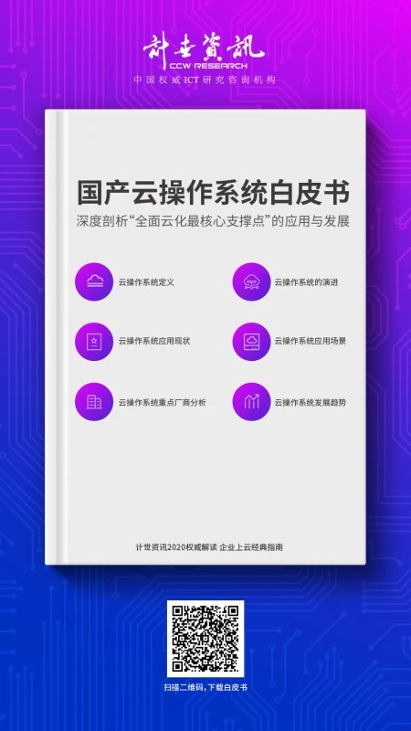 云操作系统从概念诞生,到理论论证,再到研发与实践,已经逐步成熟化,我国云操作系统产业进入到了挑战与机遇并存的阶段。2020年初,计世资讯正式发布《国产云操作系统白皮书》,对云操作系统的演进路线、产业应用、发展趋势等进行了详细的解读,对云计算用户有非常重要参考价值。