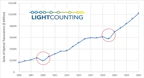 尽管金融市场出现了恐慌,但如下图所示,光网络和收发器需求的下滑可能是短暂的。考虑到增加网络基础设施带宽的紧迫性,我们预计随后将出现非常强劲的复苏。(LightCounting通过2009年的历史数据绘制了2020年市场走势)。