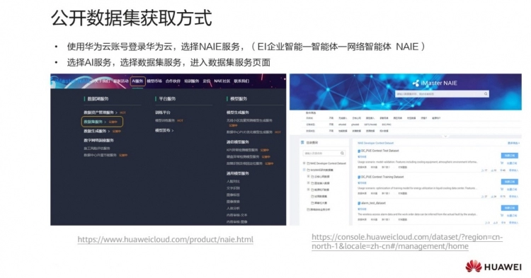 现在使用华为云账号登录华为云,选择NAIE服务(路径:EI企业智能—智能体—网络智能体 NAIE),再从AI服务目录选择数据集服务,即可进入数据集服务页面选择所需公开数据集。