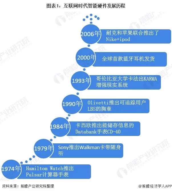 互联网时代从1974年至2006年,1974年Pulsar计算器手表的出现,拉开了设备智能化发展的帷幕。这一阶段的主要代表产品集中在手表、随身听、蓝牙耳机等产品。