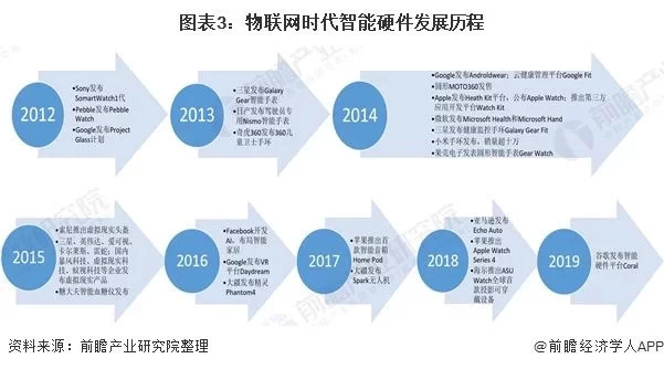 物联网时代从2012年至今,2012年SmartWatch的出现,智能硬件快速进入了消费市场,同时物联网进入了产品化的时代。2015年以来,产品品类爆发式增长。