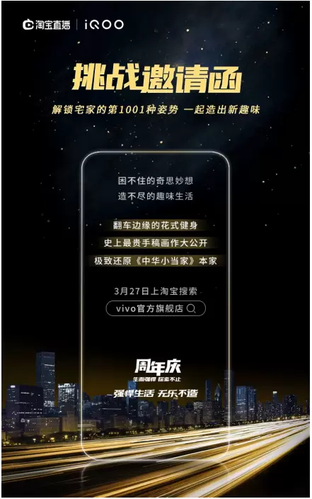 3月27日,vivo&iQOO官方旗舰店还将开启“强悍生活、无乐不造”的直播活动,B站百大up主@啊吗粽、知名美食up主@柴犬老丸子、LOFT资深插画师@嘉炜1994以及vivo产品达人@李政 将会进行花式作乐挑战接力,打破宅家无聊日常,重新发现生活的乐趣。而参与直播互动的观众,既有机会赢取价值3998元iQOO 3拉力橙新品手机、价值2399元的创维4T全面智慧屏电视机、价值600元雪花秀润燥精华露(金瓶礼盒版)、价值319元博朗3010s电动剃须刀以及限定周边礼品,并且在直接间参与购机还有独家福利加赠。