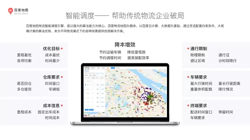 此外,百度地图提供的智能调度产品依托货车限行数据和路线规划能力,考虑物流多场景下的业务优化目标和多种约束条件,基于百度地图领先的调度算法及百度智能云的强大算力,快速生成合理调度方案,有效降低排单难度,提高排单效率,降低运输成本。