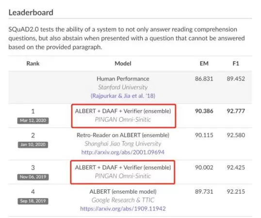 SQuAD2.0是自然语言处理的阅读理解领域最具权威性的积分榜,多年来,诸多来自全球学术界和产业界的研究团队都积极地参与其中。平安科技凭借在机器阅读理解领域多年研发积累,从2019年起多次在该榜单位居前列,尤其2019年7月份和11月份,数次战胜谷歌、科大讯飞等实力强劲选手登上榜单第一名,这是平安科技第三次登顶。