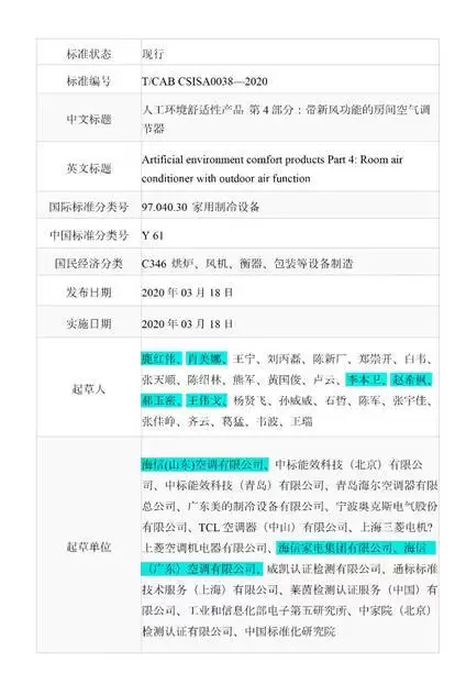 3月18日,中国产学研合作促进会首次发布了《带新风功能的房间空气调节器》团体标准,规定了“新风空调器”的定义、产品分类、技术要求等。该标准由海信空调公司副总裁鹿红伟等6位工程师作为起草人牵头制定。