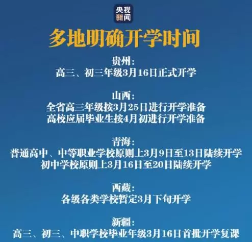 日,多地明确开学时间,即将逐渐恢复正常的教学秩序。贵州省宣布自3月16日起优先安排部署高三初三年级开学工作,而青海省通过人民政府官方网站发布了3月9日至20日部分学校陆续开学的通知,此外,山西、西藏、新疆等地也陆续明确了开学时间。