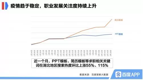 百度搜索大数据显示,近一个月,湖北地区“PPT模板”、“简历模板”等个人职业发展相关的关键词搜索量有着明显的上升趋势。