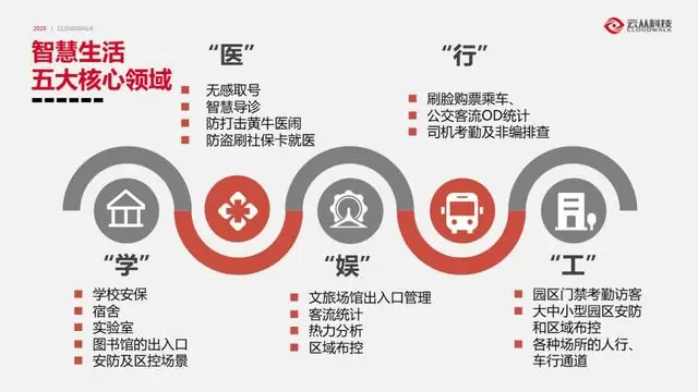 在云从核心技术的加持下,方案体系适用于"学"、"医"、"娱"、"行"、"工"五大核心领域,具有安全校园、智慧导诊、客流统计、刷脸购票乘车、公交客流、园区门禁考勤访客等丰富的应用功能,满足现代智慧生活的各个场景需求。