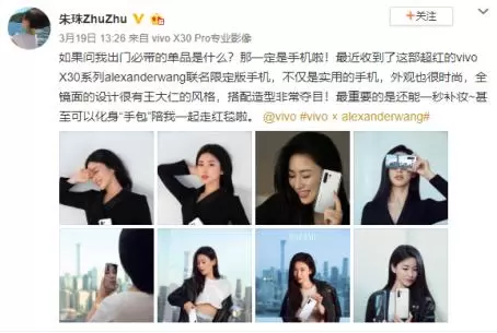 最近vivo和alexanderwang联名推出的限定版vivo X30 Pro,以全镜面外观设计引爆全网关注。宋轶、朱珠、阿云嘎、宋妍霏、袁娅维、董又霖等各界明星纷纷在微博晒机,毫不掩饰对这款时尚单品的喜爱与推荐。
