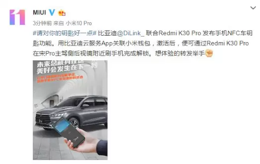 3月24日,小米旗下的Redmi真旗舰手机“Redmi K30 Pro”正式发布。此次发布的新机型除众多亮眼新功能外,最值得一提的便是比亚迪DiLink与Redmi K30 Pro联手发布的黑科技——手机NFC车钥匙;该功能的发布意味着用户可使用Redmi K30 Pro轻松解锁比亚迪汽车,从此告别传统车钥匙带来的众多烦恼。