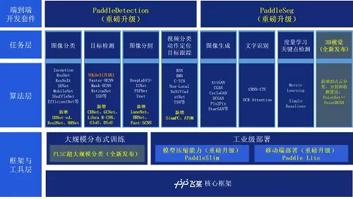 在深度学习开源路上,·百度飞桨始终保持着高频升级迭代。目前飞桨具有开发便捷的核心框架、支持超大规模深度学习模型训练、多端多平台部署的高性能推理引擎和产业级开源模型库等领先技术,媲美海外主流框架,并在多项技术上有着更优表现。