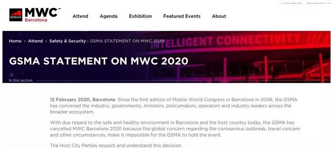 MWC是全球电信业最大的展会,原计划于2020年2月24至27日在西班牙巴塞罗那举行。但受新冠病毒疫情的影响,GSMA已于2月13日宣布,取消2020年MWC大会。