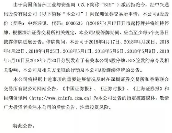 5月31日消息,昨日中兴通讯发布最新停牌进展公告,称由于美国商务部工业与安全局(以下简称“BIS”)激活拒绝令,经中兴通讯股份有限公司(以下简称“本公司”)向深圳证券交易所申请,本公司A股股份(代码:000063)自2018年4月17日开市起停牌并将维持停牌。