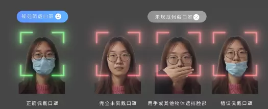 而在全新推出的“口罩佩戴检测算法”上,虹软视觉开放平台针对口罩种类丰富、佩戴位置多样等问题,在数据增强方面设计相应策略,提升了模型鲁棒性。该算法可有效识别是否规范佩戴口罩,如未佩戴口罩、错误佩戴口罩、用手或其他物体遮挡脸部等多种场景。复产企业、复课学校等可以利用该技术,及时提醒相关人员正确佩戴口罩,提升防控效率。