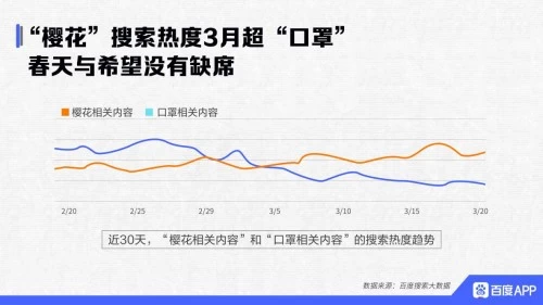 报告显示,“樱花”相关内容搜索热度在3月超过“口罩”,“武大樱花”、“武汉东湖樱园”频上热搜,人们通过“云赏花”的方式,了解着武汉樱花美景。这也反映出人们心态更加积极,在这座英雄的城市,春天与希望没有缺席。