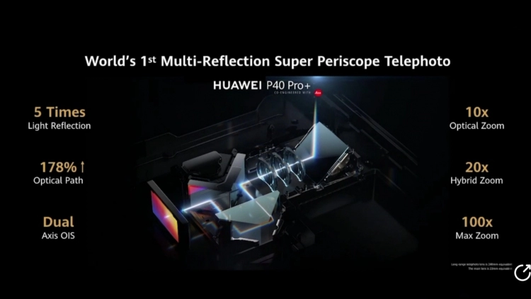 P40 Pro可实现5倍光学变焦、10倍混合变焦、50倍数字变焦;同时还在长焦端采用RYYB滤色阵列,增加进光量并提升画质。P40 Pro+配备100倍双目长焦,独创10倍多反射潜望式长焦结构,通过5次反射延长光路,光程比上一代提升178%;并为超感知主摄和双目长焦加入OIS光学防抖,实现三重OIS+AIS智慧防抖。