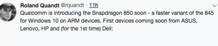 据悉,首批搭载骁龙850的厂家将包括华硕、联想、惠普、戴尔,其中戴尔将有望首发骁龙850笔记本,这款产品将采用折叠双屏设计,预装Windows 10操作系统。