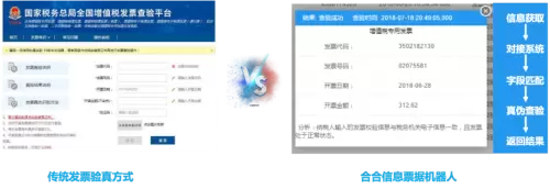 增值税发票自动验真查询:结合大数据技术,合合信息的票据机器人在进行高效准确的智能识别的同时,提供发票自动验真功能,批量联网进行发票查验,检查是否真票、错票或冲红,提升发票管理效率;