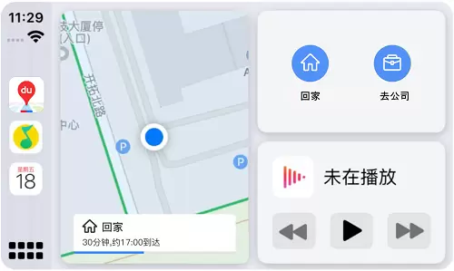 iOS13.4系统推送当日,百度地图便同步上线新版本10.23.8版本,用户升级至最新版百度地图即可使用CarPlay的分屏功能。百度地图此次还独家提供了在Dashboard页面“快捷发起导航”功能。用户将iPhone与车辆连接使用CarPlay时,在车载大屏幕的主界面上点击“回家”或“去公司”的快捷键,即可快速发起导航,操作更便捷。而且到了早晚通勤时段,百度地图可在车载大屏幕中自动提醒用户,展示此刻上下班导航的相关信息,包括路程耗时、到达时间等贴心内容。