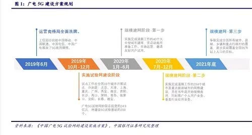 此前,广电 5G 网络建设分为两大阶段:一是 2019 年实施试验网建设, 2019 年 10月到12 月,将在 16 个城市开展规模试点工作。二是 2020 年开始的规模建网,计划于 2020 年 1-6 月实施完成清频工作的 40 个大中型城市建网,并启动商用准备工作,7-12 月,实施完成清频工作的 334个城市及重点旅游城市的网络建设且计划于 2020 年 6 月启动市场运营,并在 2021 年逐步实现覆盖全国 95%以上人口的目标。